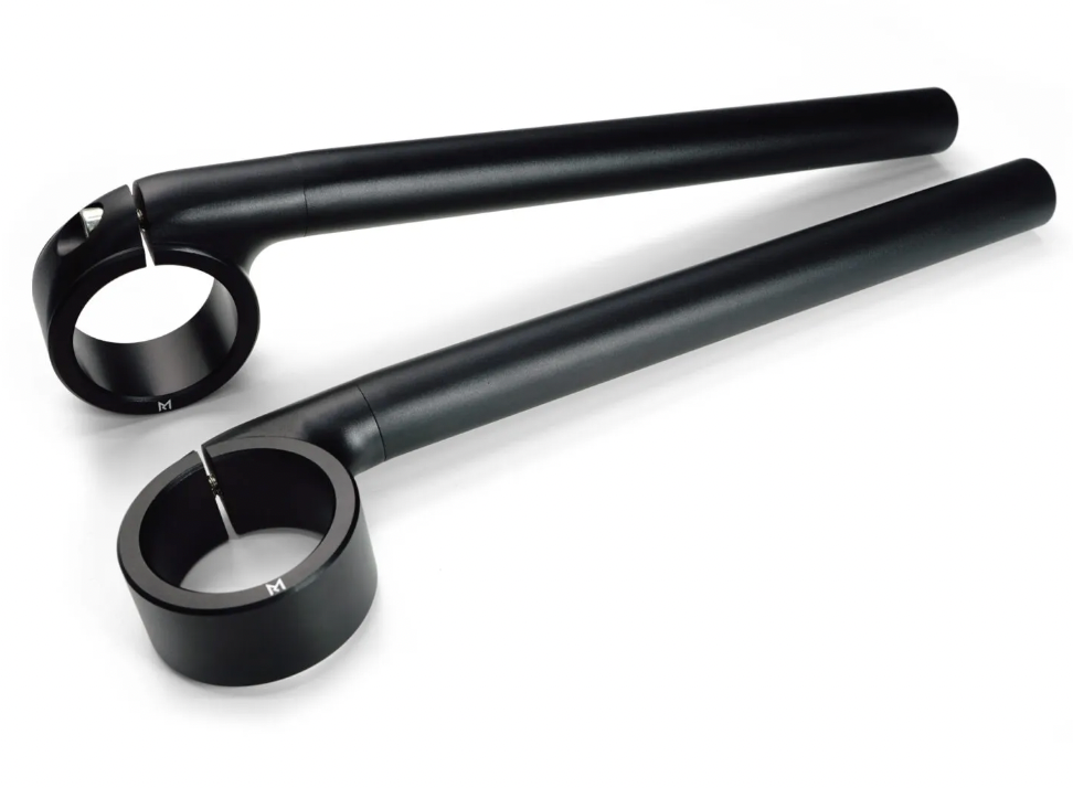 Motorcycle handlebar Clip-Ons with a low rise profile and 5° adjustable bar angle.